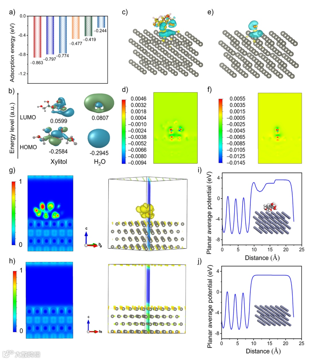 图3 (a) H2O和木糖醇分子在Zn金属的(002)平面上的吸附能(不同吸附模型见图S17)。(b) 木糖醇(左)和水分子(右)的HOMO和LUMO能级。(c) 木糖醇分子在锌金属上吸附的差分电荷密度(黄色和花菁色团簇分别代表电子密度的积累和减少)和(d) 相应的二维截面等高线图。(e) Zn晶面与H2O的差分电荷密度,(f) 对应的二维截面等高线图。添加木糖醇(g) 和不添加木糖醇(h) 锌金属的电子局域函数侧视图。有(i) 或没有(j) 木糖醇吸附时,从Zn表面到界面的平面平均势能。