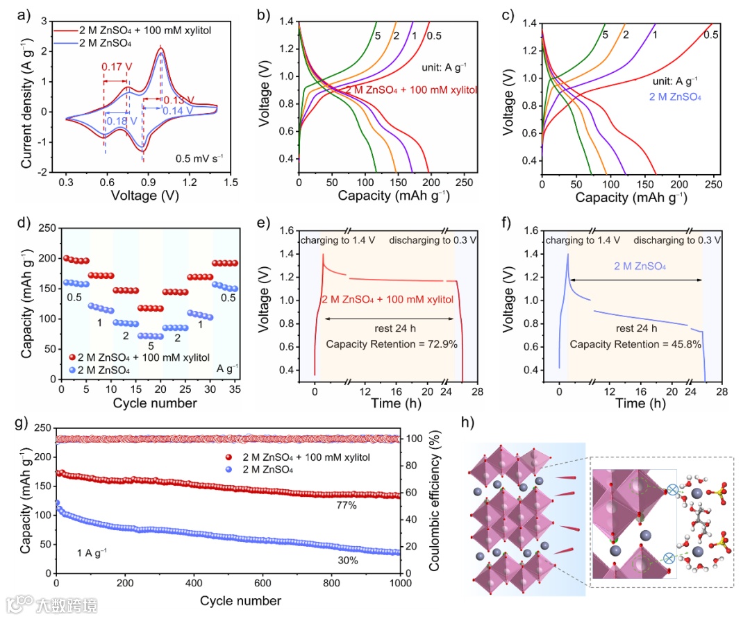 图6 (a) Zn||NaV3O8全电池在0.5 mV s−1下的CV曲线。(b) 2 M ZnSO4和(c) 含木糖醇的2 M ZnSO4电解质的GCD曲线。(d) Zn||NaV3O8全电池在不同电解质下的倍率性能。(e) 2 M ZnSO4和(f) 含木糖醇2 M ZnSO4在充电至1.4 V,静置24 h后的容量保持。(g) Zn||NaV3O8全电池在1 A g–1下使用不同电解质的循环性能。(h) 含木糖醇电解质稳定NaV3O8正极的示意图。
