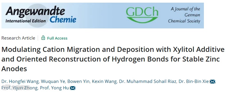 基于此,浙江师范大学的胡勇教授课题组重点关注基于木糖醇添加剂的电解液工程对于锌离子电池性能的影响。在该项研究中,研究人员通过在ZnSO4溶液中加入少量木糖醇分子作为添加剂,实现氢键网络的定向重构,显著提升镀锌/剥离的可逆性以及锌离子电池的储能性能。其成果以题为“Modulating Cation Migration and Deposition with Xylitol Additive and Oriented Reconstruction of Hydrogen Bonds for Stable Zinc Anodes”在国际知名期刊Angew. Chem. Int. Ed.上发表