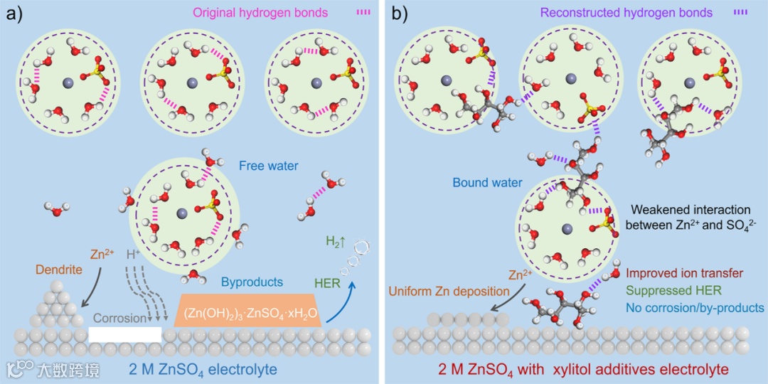 图1. (a) 2 M ZnSO4, (b) 含木糖醇添加剂的2 M ZnSO4电解质的Zn2+溶剂鞘结构和界面化学的图示。