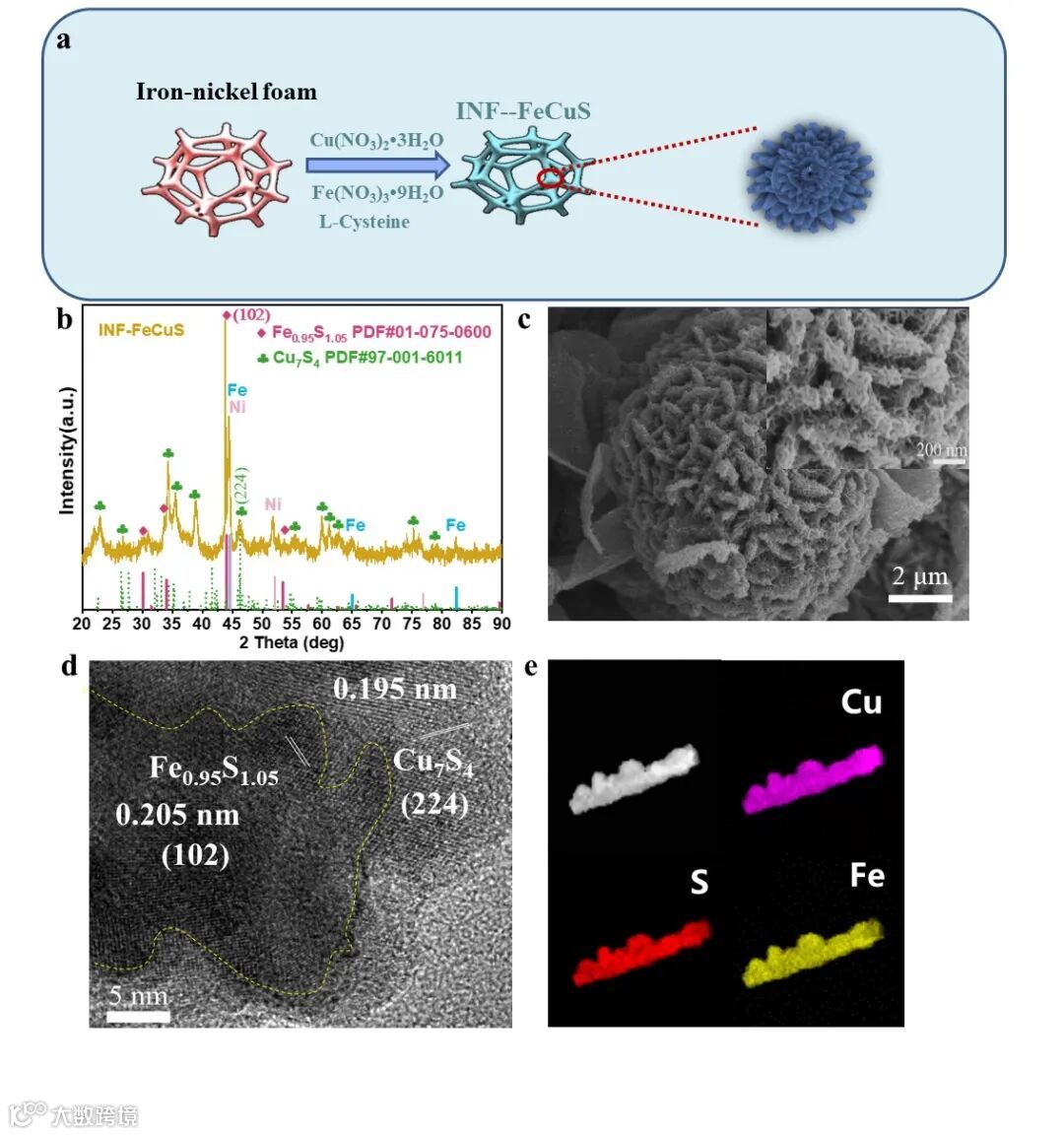 Fig. 1. (a) Preparation schematics of INF-FeCuS. (b) XRD pattern of INF-FeCuS. (c) SEM image of INF-FeCuS. (d) HR-TEM image of INF-FeCuS. (e) elemental mapping of INF-FeCuS.