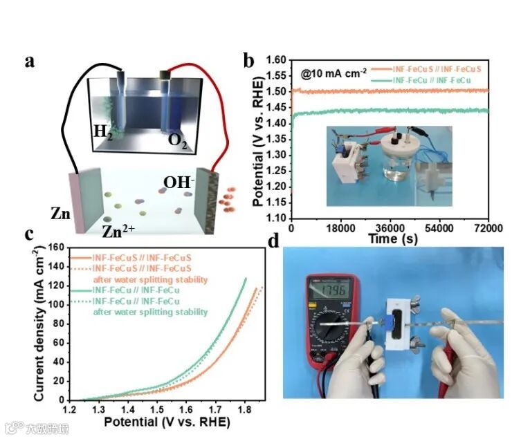 Fig. 4. (a) Schematic diagram of a shared electrode constructed AHZB coupled in series with electrolyzer. (b) Performances of water splitting with the different electrodes: stability curves at a current density of 10 mA cm-2, inset showing the electrolyzer with both INF-FeCuS electrodes driven by the single aqueous AHZB with INF-FeCuS cathode to produce H2. (c) water splitting polarization curves before and after stability tests. (d) Open circuit voltage of single connected aqueous AHZB.