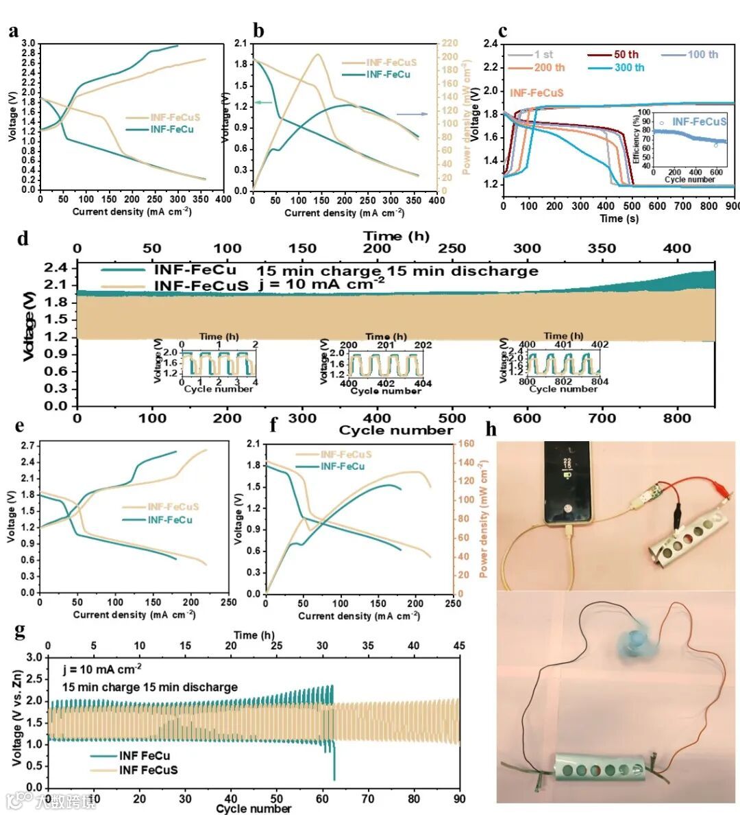 Fig. 3. Performances of aqueous AHZBs with INF-FeCu and INF-FeCuS as cathode: (a) Charge and discharge polarization curves, (b) power density curves, (c) Charge and discharge curves at the different charge-discharge cycles, the inset shows the energy efficiency curve and (d) cycle stability curves (15 min charge and 15 min discharge at a current density of 10 mA cm-2). (e) Charge-discharge curves, (f) power density curves and (g) cycle stability performances at 10 mA cm-2 of the flexible AHZBs with INF-FeCu and INF-FeCuS as cathodes. (h) Application demonstration of the flexible AHZB.