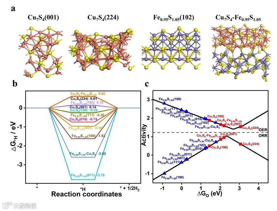 Fig. 5. (a) Models of Cu7S4 (001), Cu7S4 (224), Fe0.95S1.05 (102) and composite system composed of FFe0.95S1.05 (102) and Cu7S4 (224). (b) Free energy profiles of HER processes on various Cu-containing and Fe-containing models. The asterisk (*) denotes to the adsorption site. (c) Volcano plot of OER and ORR activities in relation to GO. Blue triangles denote to the Fe sites and red squares denote to the Cu sites.