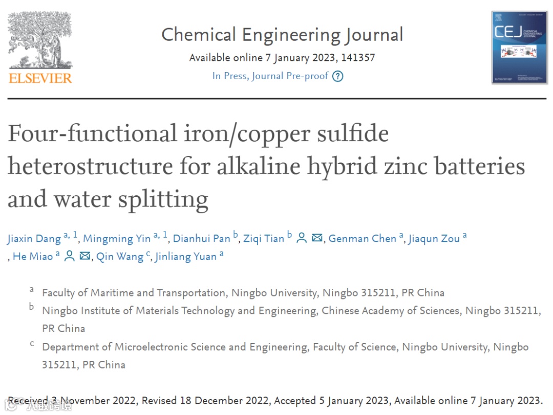基于此,宁波大学的苗鹤教授与中国科学院宁波材料所的田子奇研究员合作,在国际知名期刊Chemical Engineering Journal上发表题为“Four-functional iron/copper sulfide heterostructure for alkaline hybrid zinc batteries and water splitting”的研究成果。