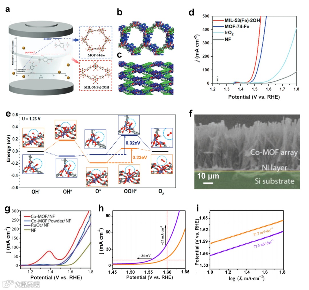 目前贵金属铱和钌的氧化物(IrO2和RuO2等)仍是最高效的基准OER电催化剂。一般有几种策略来提高MOFs材料滞后OER的动力学:一是构建阵列纳米结构或将MOFs制备成二维导电纳米片;二是构建具有不饱和金属配位点的MOFs;三是引入不同的功能化配体,并通过改变金属/金属簇的数量来构建多金属组分的MOFs;四是通过复合纳米颗粒或无机活性材料来调节电子结构,并通过调节界面耦合来实现改性/重构等。
