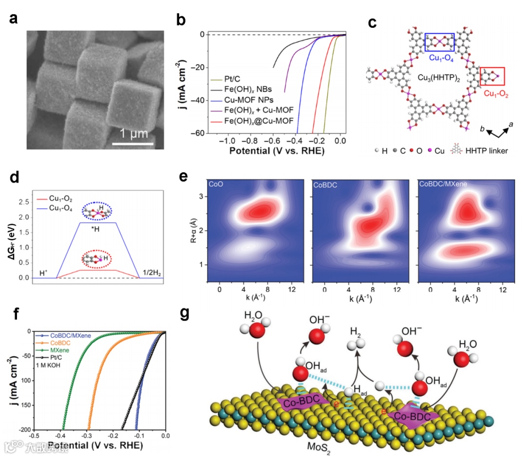 此外,利用双核金属簇形成具有双金属活性位点的MOFs是一种提升电催化活性的有效策略,因为不同金属中心之间的协同效应可以调节金属中心的电子结构和表面状态,以达到优化催化性能的目的。由于其独特的孔隙和丰富的官能团,MOFs是负载金属纳米颗粒或单原子的良好载体。与具有催化活性的无机活性材料复合也是提高催化活性的有效策略,这可以从机理上优化氢吸附能和水解离能,从而促进整体析氢活性。