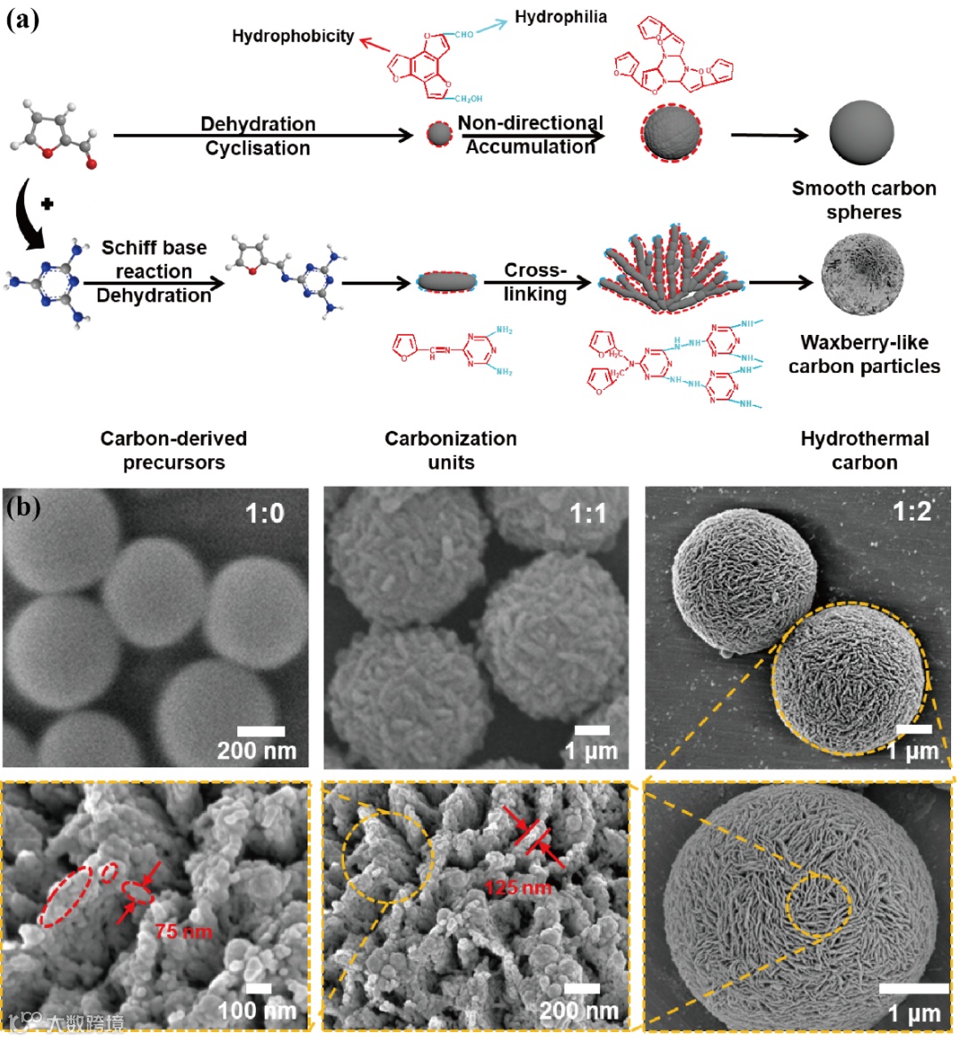 原则上,在水热条件下,糠醛和含有更多亲水基团的三聚氰胺快速席夫碱反应在早期阶段形成亲水的碳化单元,实现亲水和疏水的分离。同时,由于在亲水部分的外部位置发生了π-π堆积和反应,疏水部分在组装时被积累。通过在疏水前驱体的分子结构中引入亲水部分,亲水和疏水部分可以自发分离,从而在形成碳颗粒时进行组装和堆积,在不影响碳源前驱体形成的情况下赋予它们独特的结构。