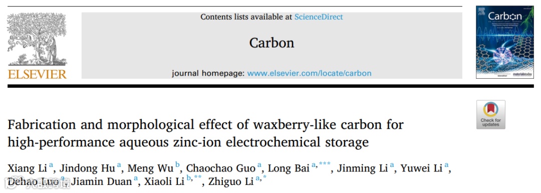 基于此,来自东北林业大学的李志国教授课题组在国际知名期刊Carbon上发表题为“Fabrication and morphological effect of waxberry-like carbon for high-performance aqueous zinc-ion electrochemical storage”的文章。该文章通过一步法水热碳化制备杨梅状球形碳颗粒,充分利用其独特的形貌效应在各种测试条件下都取得了优异的储能性能,可用于一系列环境条件下的水系可充电锌离子储能装置。