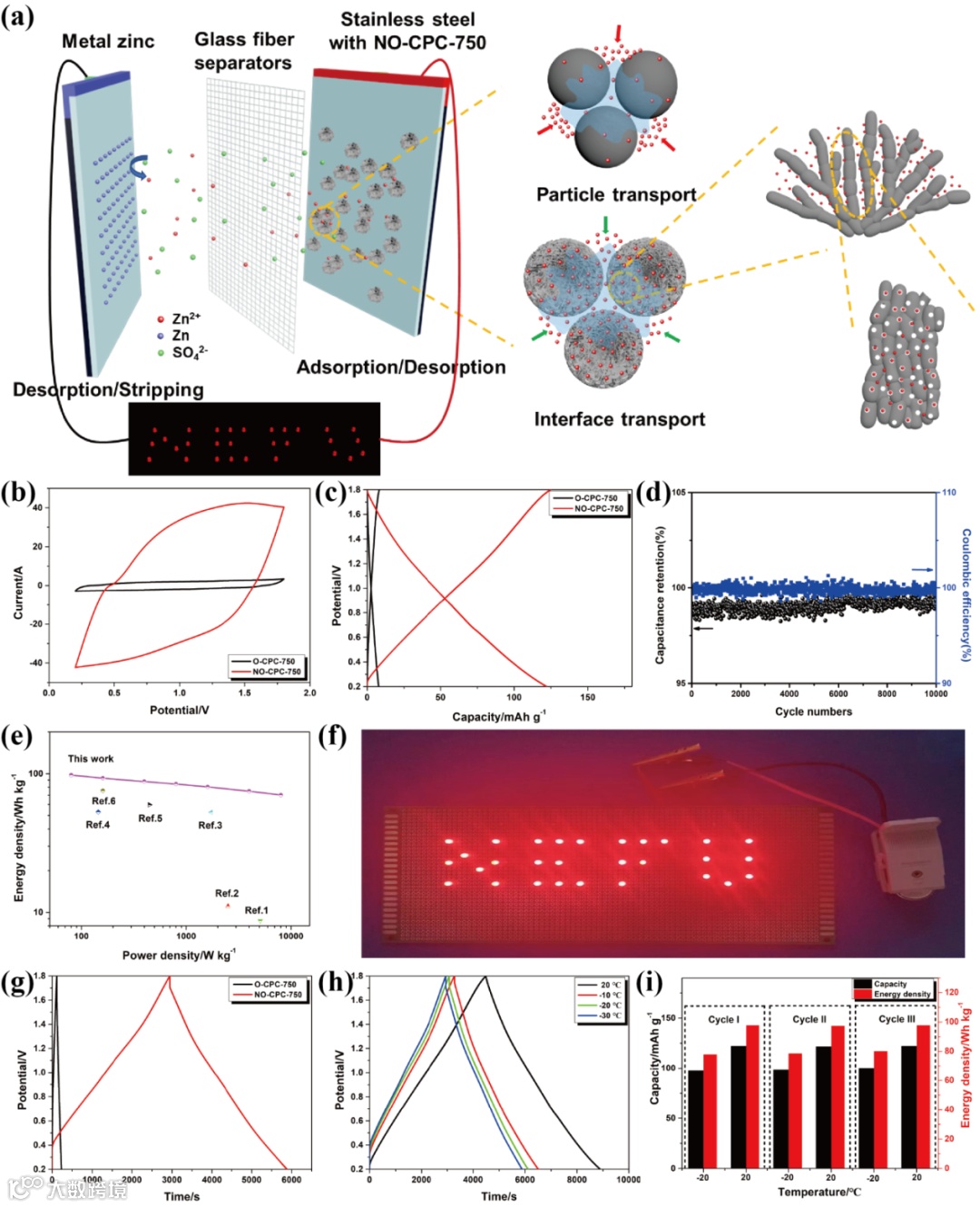 图3. 通过锌离子混合超级电容器电池系统用2 M ZnSO4电解液测试NO-CPC-750阴极的电化学性能。(a) 锌离子混合超级电容器的工作机制和设备组装示意图;(b) O-CPC-750//Zn和NO-CPC-750//Zn在扫描速率为200 mV s-1时的CV曲线;(c) O-CPC-750//Zn和NO-CPC-750//Zn在电流密度为0.1 A g-1时的GCD曲线;(d) NO-CPC-750//Zn在电流密度为2 A g-1时的循环稳定性为10000次;(e) 组装的NO-CPC-750//Zn的Ragone图与文献中的报告值相比较;(f) 由两个串联的NO-CPC-750//Zn供电的LEDs(29);(g) 在电流密度为0.1 A g-1时,O-CPC-750//Zn和NO-CPC-750//Zn的GCD曲线为-30 ℃;(h) NO-CPC-750//Zn在-30至20 ℃温度下,电流密度为0.1 A g-1时的GCD曲线;(i) 组装的锌离子混合超级电容器在低温(-20 ℃)和室温(20 ℃)之间循环的容量和能量密度柱状图