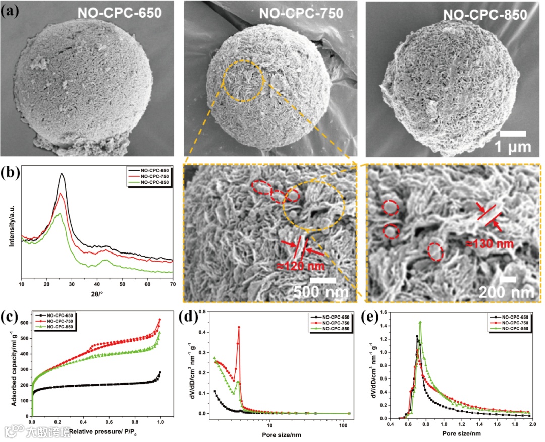 图2. (a) SEM图像,(b) XRD分析,(c) 氮气吸附/解吸等温线,(d) 多孔碳颗粒在不同温度下活化的中孔尺寸分布(Barrett-Joyner-Halenda法),以及(e) 微孔尺寸分布(Harvath-Kawazoe法);(a) 中的放大图像显示了NO-CPC-750的表面结构,它被片状(尺寸达130 nm)和备用碳颗粒包裹着