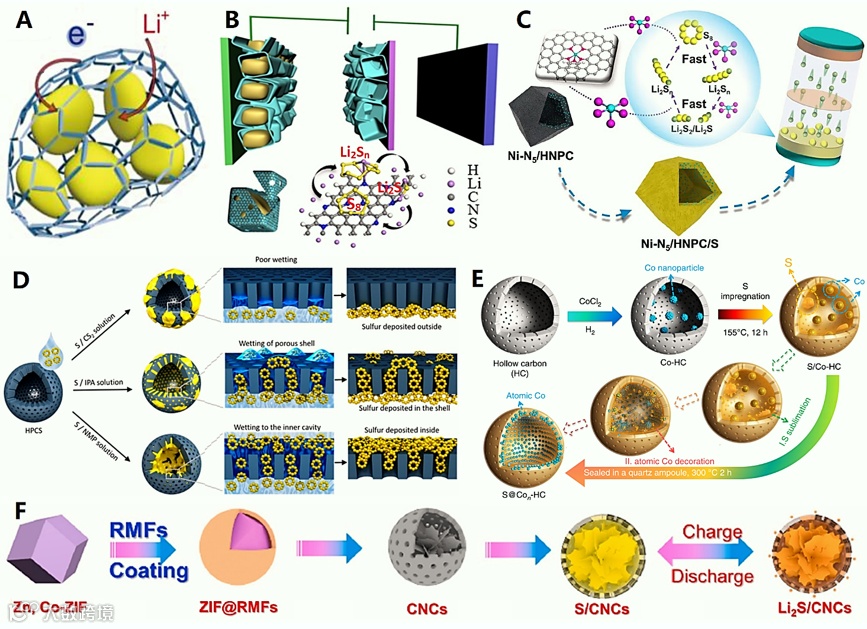 图1 用于高性能锂硫电池的空心碳纳米笼【1】: (A) S@graphene-like碳纳米笼,(B) S@cubic碳纳米笼,(C) S@polyhedral碳纳米笼,(D) S@hollow多孔碳球,(E) S@Con-hollow多孔碳球,(F) S@carbon纳米片/多孔碳瓶中船结构。
