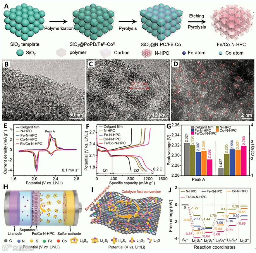 图2 Fe/Co单原子修饰的互连小尺寸N掺杂空心碳纳米笼用于高性能锂-S电池: (A)合成工艺示意图,(B-D)结构表征,(E-G)电化学性能,(H)器件原理图,(I)多硫化物转换原理图,(J)自由能的理论计算【1】。