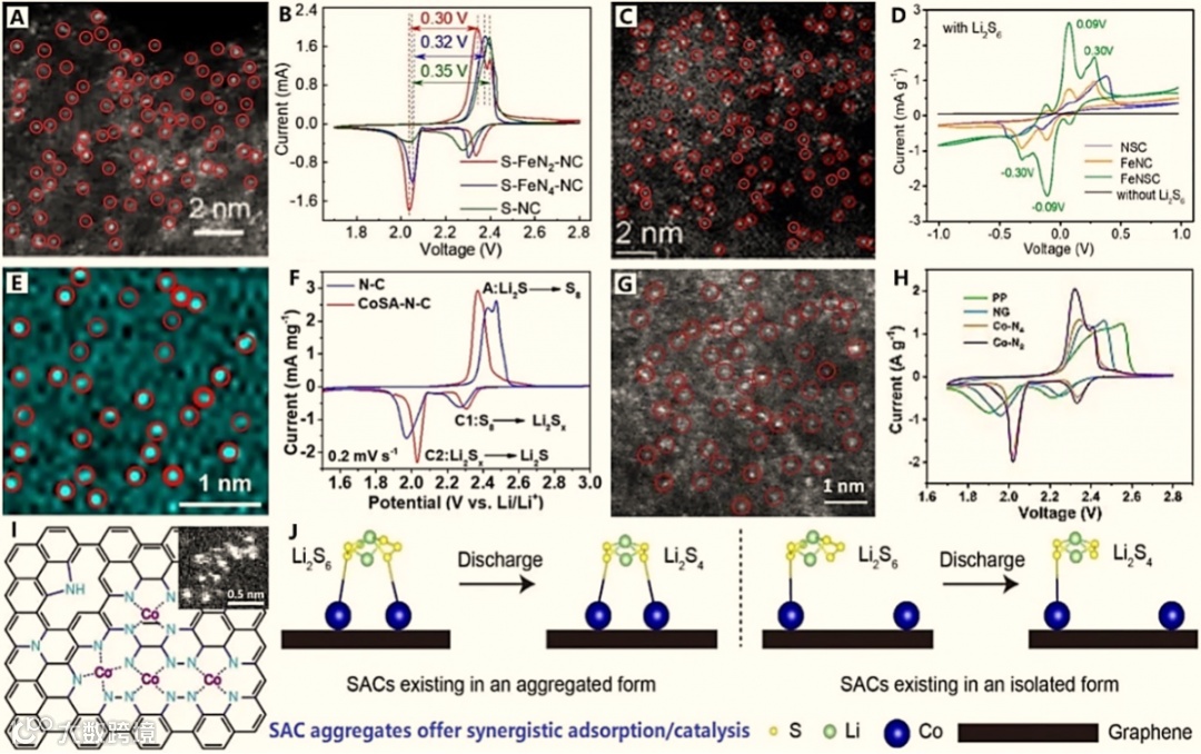 图4基于超高密度SACs多硫化物的催化转换:(A和B) FeN2-NC,(C和D) Fe-NSC,(E和F) CoSA-N-C,(G和H) CoN2,(I, J) Co-SAC【3】。