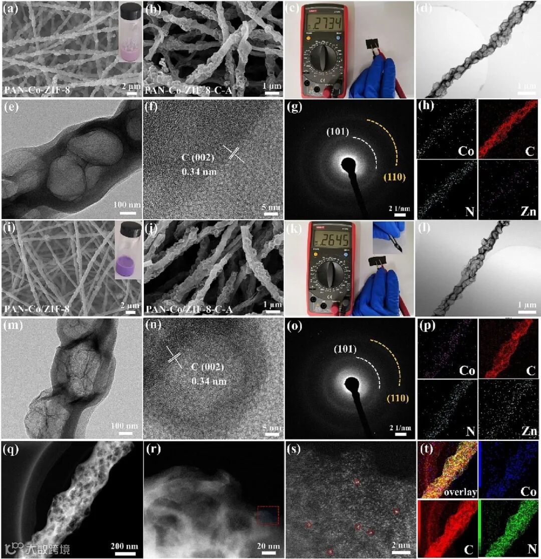 经由扫描电镜、透射电镜、球差电镜可以观察到,经过高温碳化和酸洗后,衍生样品表现出了前驱体的一维串联结构,并且分散良好,出现了空腔结构,并且证实了良好控制的Co吸附含量,没有Co聚集体的衍射条纹以及衍射环,表明其金属位点的原子分散。此外,衍生物具有一定的柔韧性以及良好的导电性。通过傅里叶光谱、X射线衍射、拉曼、热重分析、N2吸脱附测试以及X射线光电子能谱等表征手段考察了前驱体的转变温度,衍生物成分、孔径分布、电子结构等特征,进一步证明了材料的物相组成和结构特性。