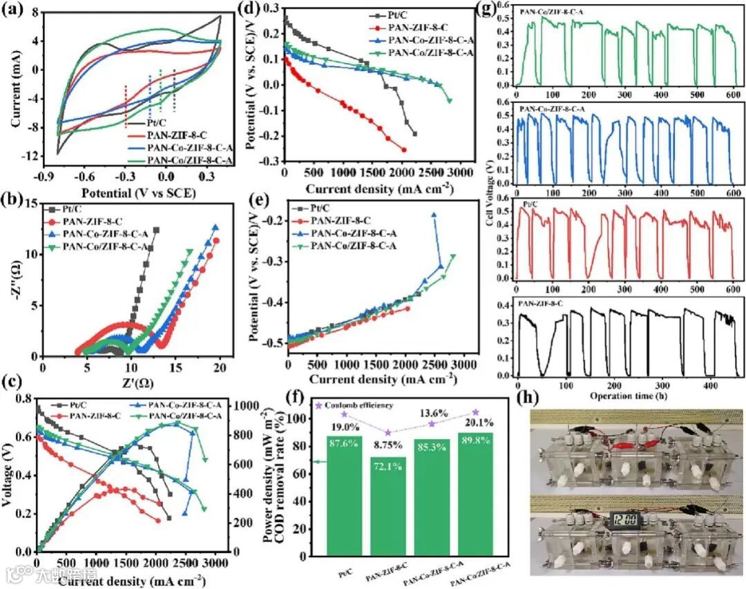 其次,将PAN-Co-ZIF-8-C-A和PAN-Co/ZIF-8-C-A用作燃料电池阴极催化层。一方面,PAN-Co-ZIF-8-C-A和PAN-Co/ZIF-8-C-A电催化剂改性的MFC获得了更高的功率密度(869.6和888.3 mW cm−2),优于Pt/C和未改性样品。特别地,MFC-PAN-Co/ZIF-8-C-A具有最优的COD去除率以及库仑效率。此外,基于PAN-Co/ZIF-8-C-A修饰的DMFC也表现出了较高的功率密度(23.27 mW cm-2),接近于Pt/C催化剂(25.63 mW cm-2)。