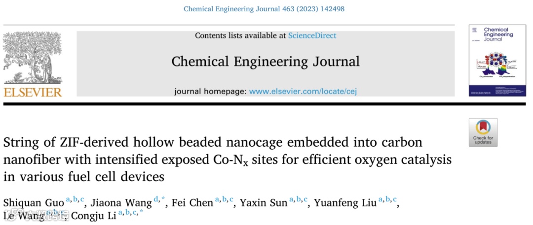 基于此,北京科技大学博士生郭仕权同学在知名期刊Chem. Eng. J. 上发表题为“String of ZIF-derived hollow beaded nanocage embedded into carbon nanofiber with intensified exposed Co-Nx sites for efficient oxygen catalysis in various fuel cell devices”的研究论文,该工作通过控制静电纺纳米纤维与沸石咪唑酯骨架(ZIF)以及金属盐的结合类型,合理调控了衍生物中Co-Nx活性位点的分散。合成了碳纳米纤维负载的空心珠状纳米笼结构,该纳米笼在腔壁中具有暴露的Co-Nx位点,在MFC以及DMFC中实现了高效的氧催化进程。