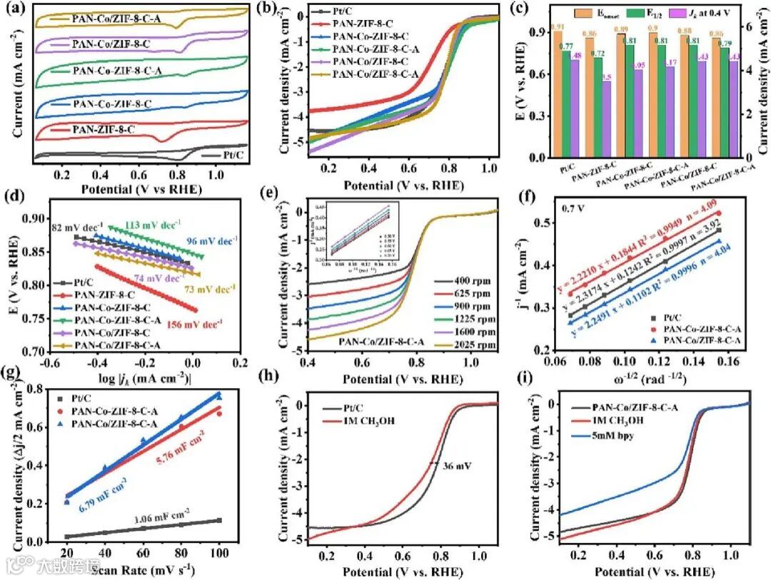 首先,利用旋转圆盘电极(RDE)测试了样品的电催化性能(起始电位、半波电位、电流密度、电子转移、电化学表面积等)。结果表明PAN-Co-ZIF-8-C-A和PAN-Co/ZIF-8-C-A展现出了可比拟Pt/C的催化活性,并且具有优异的甲醇耐受性,拓展了其在燃料电池中的应用前景。其优异ORR性能可归因于以下方面: