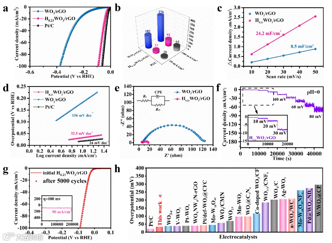 图4. H0.23WO3/rGO电催化剂的HER性能