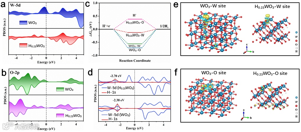 DFT计算表明,间隙氢原子与H0.23WO3中的晶格氧有很强的相互作用,降低了表面活性W位的d轨道的电子密度分布。因此,与WO3相比,H0.23WO3表面活性位点电子密度的降低导致了更低的氢气吸附能和更弱的W-H键,从而充分促进了催化剂表面活性H*中间物的快速解吸。因此,H0.23WO3催化剂可以实现更有利的动力学,并对HER具有良好的催化活性。