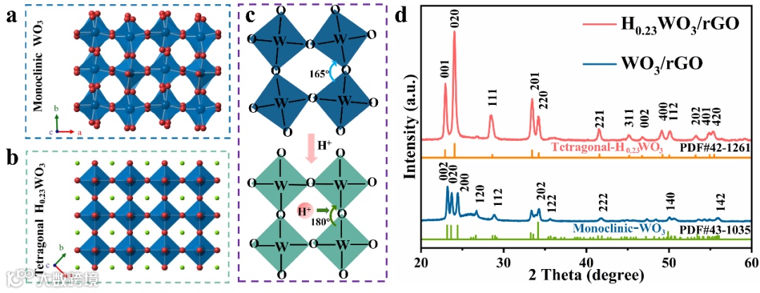 图2. H+插入间隙位引起的单斜相WO3向四方相H0.23WO3的结构转变以及 H0.23WO3/rGO和WO3/rGO的XRD图谱