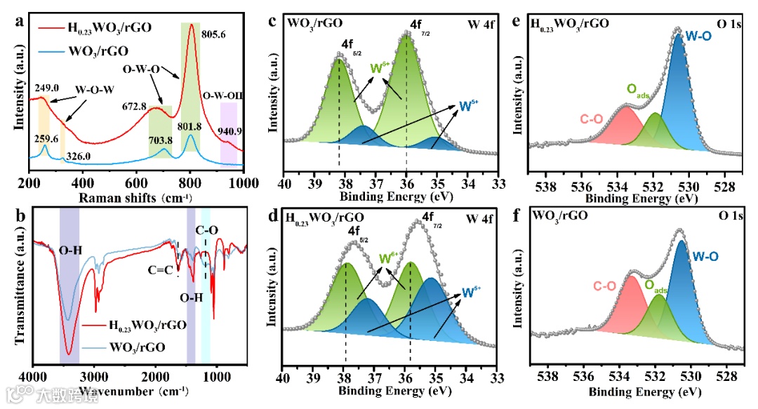 XRD图谱为鉴定H0.23WO3/rGO的晶体结构提供了关键证据。此外,HRTEM和FFTs结果清楚地表明了H原子插入WO3晶格前后晶体结构的差异。WO3中的间隙H原子插入必然会产生过量的W-OH基团,并导致用于电荷补偿的W的化学价的降低,这已通过本文中的FTIR、拉曼和XPS结果得到证实。