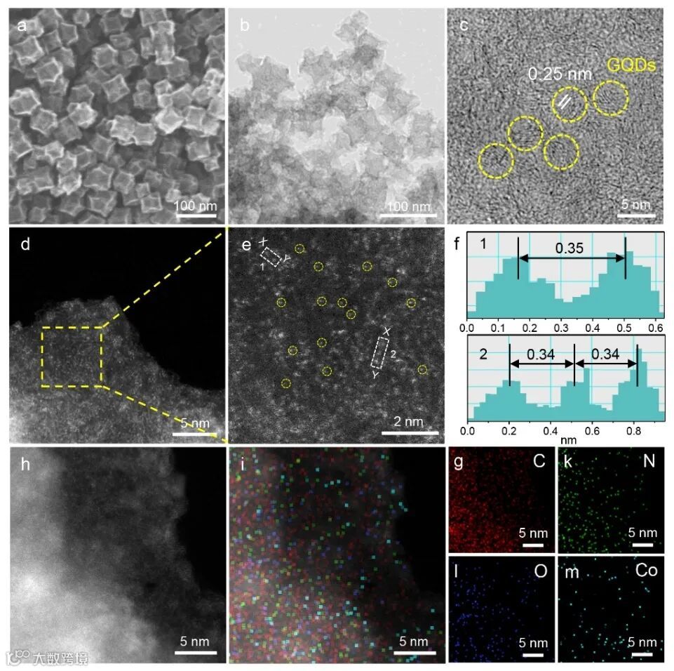 高分辨透射电镜(HR-TEM)和像差校正大角度环形暗场扫面透射电镜(AC-HAADF-STEM)图谱显示均匀分散的GQDs,其晶格间距为0.25 nm,说明GQDs的引入参与构建了局部导电网络,实现了碳缺陷的修复。同时,AC-HAADF-STEM图像显示G-CoNOC中存在大量高度分散的亮点,表明碳基体中存在致密的单原子Co活性位点(图3)。