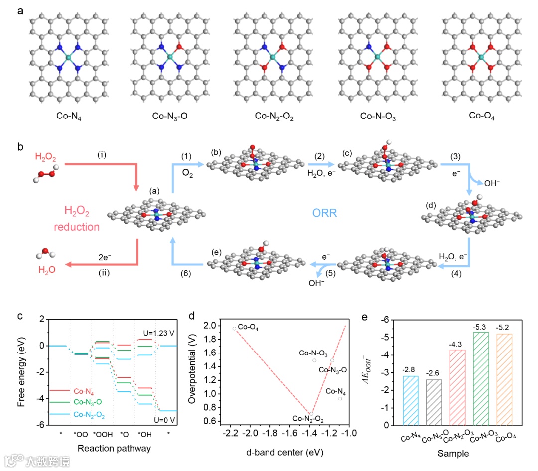 图7 不同Co-N/O-C模型上ORR催化活性的DFT计算。a) Co-N4、Co-N3-O、Co-N2-O2、Co-N-O3和Co-O4结构示意图。b) Co-N2-O2模型上ORR和H2O2还原机理示意图。c) U= 0 V和U= 1.23 V时,不同模型的自由能分布。d) 理论计算的d带中心与过电位的相关性。e) 在不同模型上的OOH−吸附能。