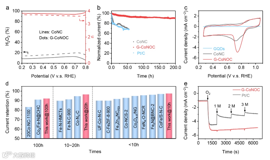 图6 a) H2O2产率和电子转移数(n)。b) 在0.7 V vs. RHE下,CoNC、G-CoNOC和Pt/C电催化剂的循环耐久性。c) CoNC、G-CoNOC和GQDs的H2O2催化活性。d) G-CoNOC与其他Co/Fe基电催化剂的耐久性比较。e) 与商业Pt/C相比,G-CoNOC对甲醇的耐受性。