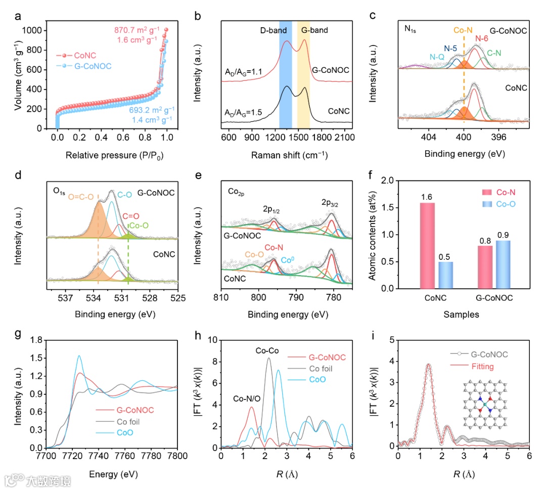 图4 a) CoNC和G-CoNOC的N2吸附/脱附等温线。b) 拉曼光谱。CoNC和G-CoNOC的c) N1s谱,d) O1s谱,e) Co2p谱。f) N1s和O1s谱中催化剂的Co-N和Co-O含量。g) Co K边XANES光谱。h) Co K边的傅里叶变换k3-加权x(k)-函数EXAFS图谱。i) R空间对应的EXAFS拟合曲线,内为结构示意图模型。
