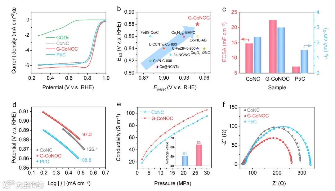 图5 电催化剂的ORR性能。a) 在O2饱和的0.1 mol L−1 KOH溶液中,1600 rmp下的LSV曲线。b) G-CoNOC与近期报道的Co/Fe基电催化剂的ORR性能比较。c) 催化剂与Pt/C之间ECSA和JK的差异。d) Tafel斜率。e) 采用四探针法测定的电导率。f) 在0.86 V vs RHE下测量的Nyquist曲线。