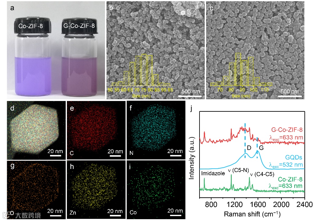 将GQDs与Co和Zn盐混合,加入2-甲基咪唑配体后得到G-Co-ZIF-8前驱体,实现GQDs对结构的配位调控。元素Mapping和拉曼光谱分析结果证实GQDs参与了G-Co-ZIF-8前驱体的形成,并成功地引入G-Co-ZIF-8前驱体中(图2)。