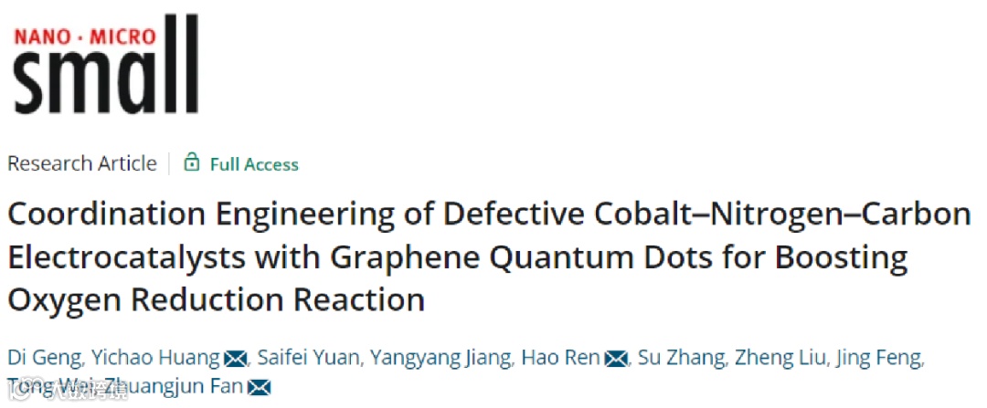 基于此,来自中国石油大学(华东)/哈尔滨工程大学的范壮军教授和中国石油大学(华东)的黄毅超教授和任浩副教授,在国际知名期刊Small上发表题为“Coordination Engineering of Defective Cobalt-Nitrogen-Carbon Electrocatalysts with Graphene Quantum Dots for Boosting Oxygen Reduction Reaction”的研究文章。