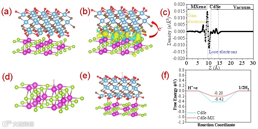 图4. DFT计算CdSe-MXene的结构模型(a),电荷密度差(b)和沿Z方向的平面平均电子密度差(c), CdSe (d)和CdSe-MX (e)吸附H的示意性结构模型, CdSe和CdSe-MX反应的自由能图(f)。