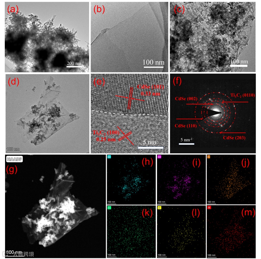 图2. (a) CdSe, (b) MXene, (c-e) CdSe-MXene的TEM和HRTEM图像,(f) SAED图像,(g-m) HAADF-STEM图像以及相应的元素分布。