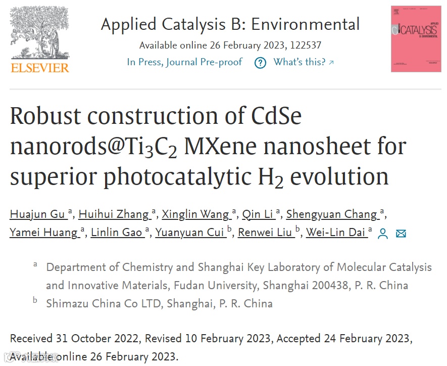 基于此,复旦大学戴维林教授在国际知名期刊Applied Catalysis B: Environmental上发表题为“Robust construction of CdSe nanorods@Ti3C2 MXene nanosheet for superior photocatalytic H2 evolution”的研究论文(DOI:10.1016/j.apcatb.2023.122537)。
