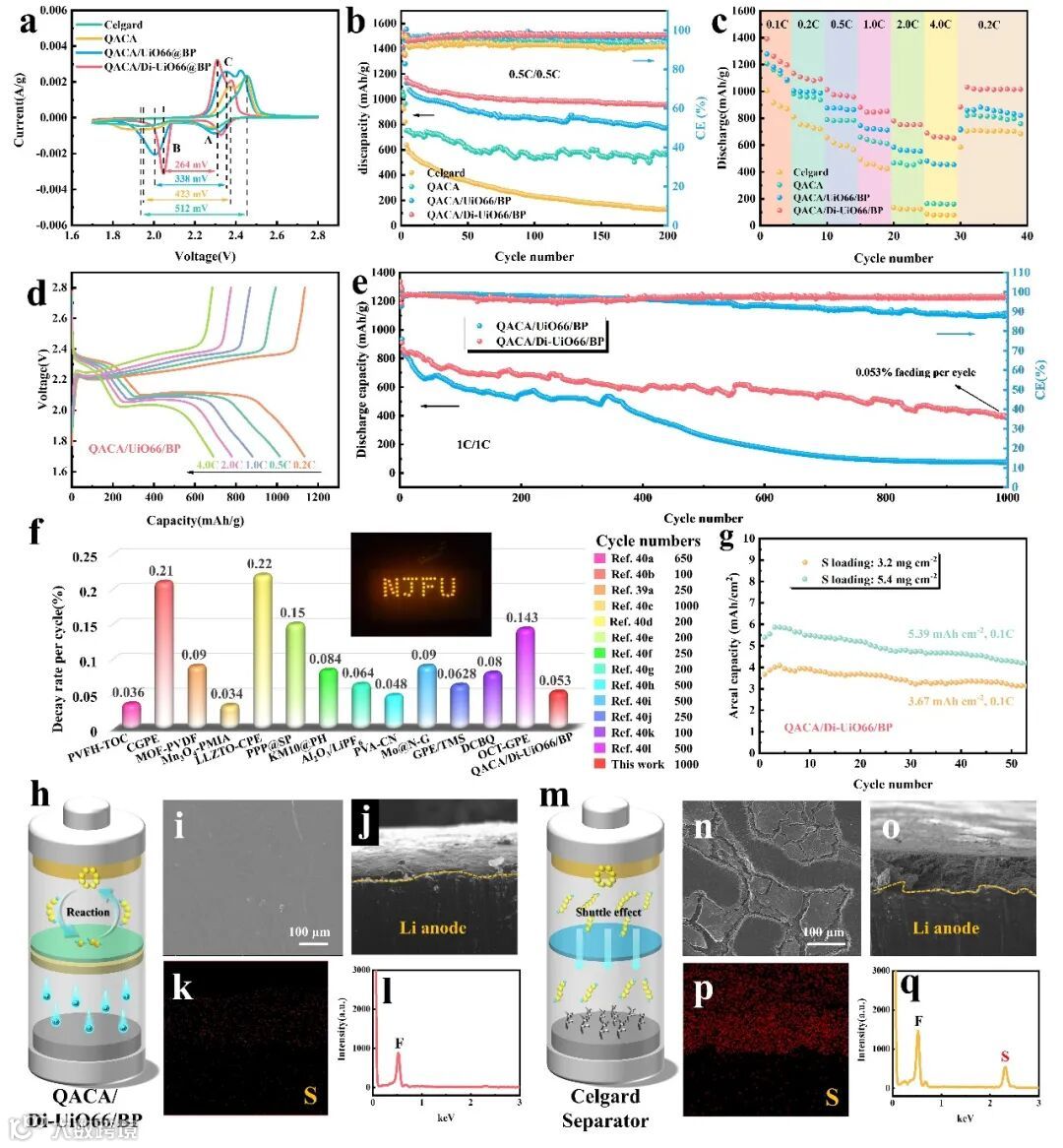 将缺陷离子化的Di-UiO66/BP异质结通过真空抽滤到阳离子型纤维素电解质表面,组装电池并评估了非对称纤维素电解质对于锂硫电池电化学性能提升的影响。结果表明非对称电解质能同时抑制多硫化锂的穿梭效应和锂枝晶的生长,锂硫电池在1000圈循环后仍保留383.9mAh/g的高比容量,每圈容量衰减率仅为0.053%。
