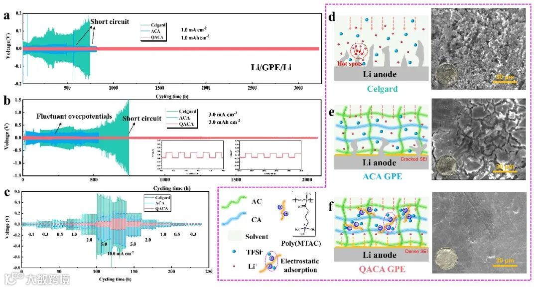 图3 阳离子型纤维素电解质QACA对于锂负极稳定性测试及机理