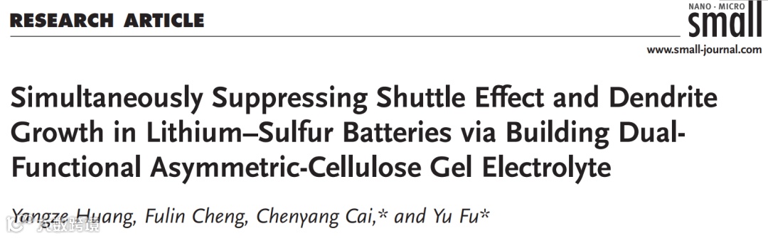 基于此,南京林业大学付宇课题组在国际知名期Small上发表题为“Simultaneously Suppressing Shuttle Effect and Dendrite Growth in Lithium–Sulfur Batteries via Building Dual Functional Asymmetric-Cellulose Gel Electrolyte”的观点文章。该文章制备了一种非对称型纤维素电解质来解决锂硫电池中的穿梭效应以及锂枝晶生长的问题,为生物质材料在锂硫电池的应用提供了新的思路。