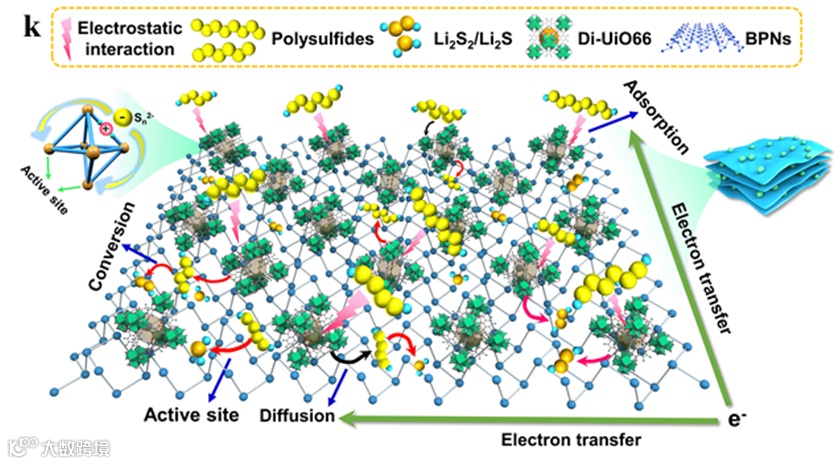 在之前的工作中,我们团队已经利用油水界面自组装的方法制备了UiO66/黑磷异质结(Chemical Engineering Journal, 2023, 454: 140250),但异质结对于多硫化锂的催化性能仍然不满意,因为MOF 材料对于多硫化物的吸附和催化性能较差。为此,我们对异质结中的UiO66进行了缺陷化和离子化的处理,缺陷化使得UiO66暴露更多的金属Zr位点,提升了MOF的催化活性;离子化工程则使得配体氨基官能团季铵盐阳离子化,使得MOF能通过静电吸附效应捕获负电荷的多硫根离子。通过电化学测试表明多硫化锂在异质结界面上实现快速吸附-催化-转化的过程,有效地抑制了多硫化锂的穿梭效应。