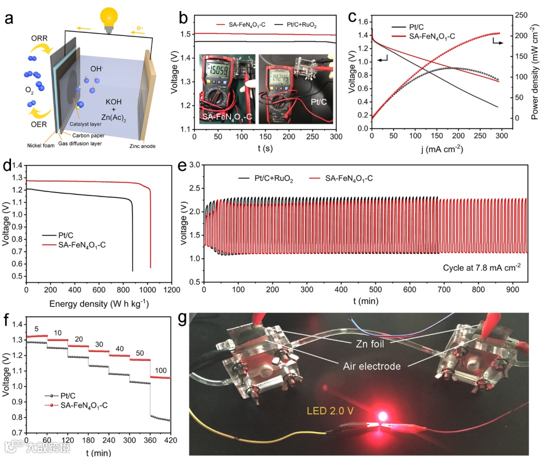 图6. 分别使用SA-FeN4O1-C和Pt/C+RuO2作为空气电极的ZAB性能对比测试。(a) ZAB原理图;(b) 开路电压;(c) 放电极化曲线和功率密度;(d) 能量密度图;(e) 充放电循环曲线;(f) 不同电流密度下的放电平台;(g) 点亮红色LED的实物图。