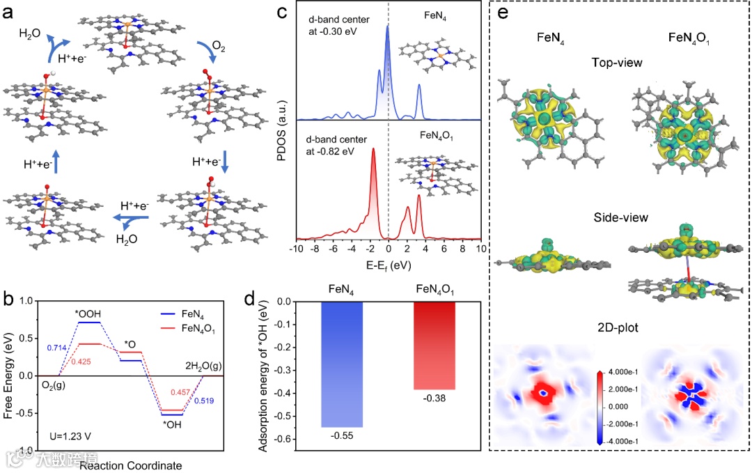 图4:(a)Fe-N4O1的4电子 ORR路径(C灰色,N蓝色,O红色,H白色,Fe橙色),(b)ORR反应历程自由能变化图;(c)Fe-3d轨道的PDOS曲线;(d)OH的吸附能;(e)Fe-N4和Fe-N4O1的电荷差分密度图。