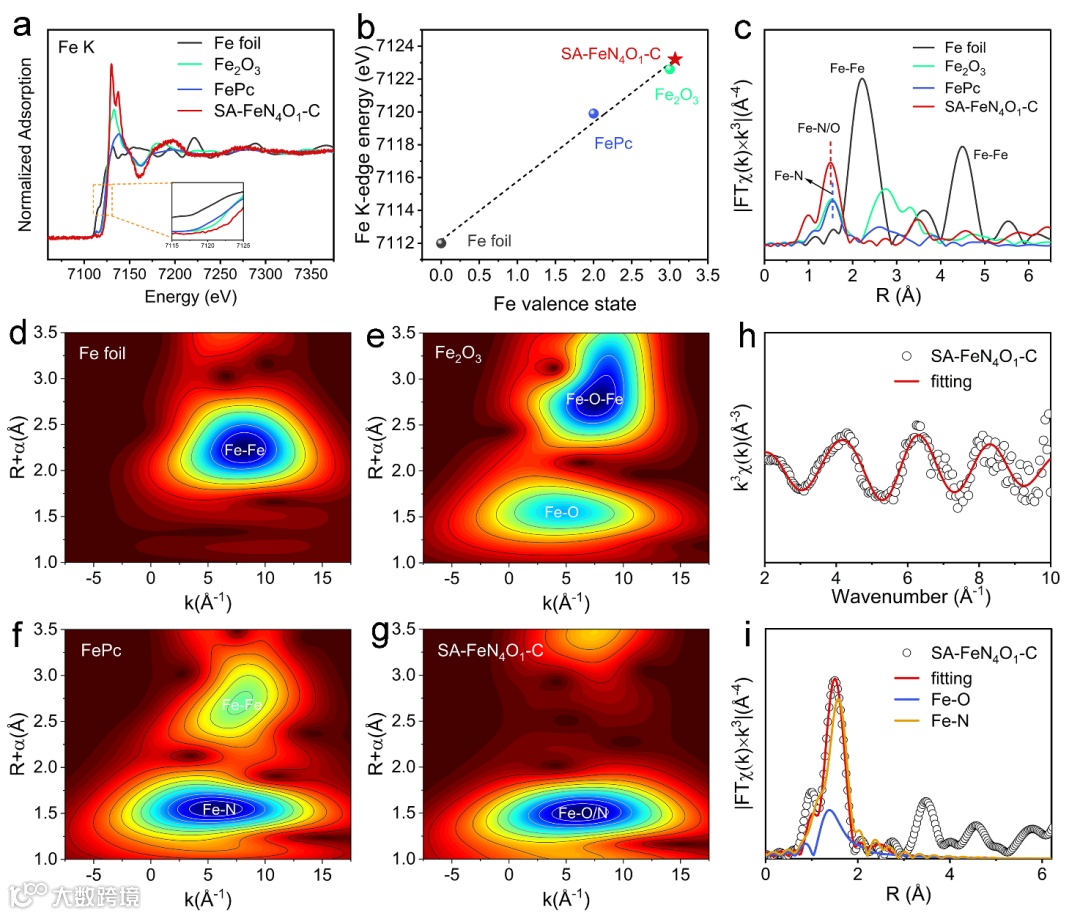 图2. SA-FeN4O1-C的XAFS测试。(a) Fe K-边XANES光谱;(b) 拟合氧化状态的第一衍生Fe K-边XANES光谱;(c) k-加权傅里叶变换扩展X射线吸收精细结构(EXAFS)光谱;(d, e, f, g) EXAFS WT分析;(h) EXAFS在k-空间;(i)R-空间的拟合曲线。