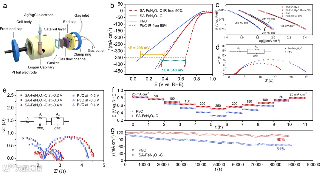 图5 (a) GDE电池简图;(b) ORR LSV极化曲线;(c) Tafel图;(d) 在-0.1 V下对Ag/AgCl的Nyquist图;(e) 在-0.2、-0.3和-0.4 V对Ag/AgCl的Nyquist图,插图:等效电路模型;(f) 在不同的电流密度下的计时;(g) 通过i-t 计时电流法测试的稳定性曲线。