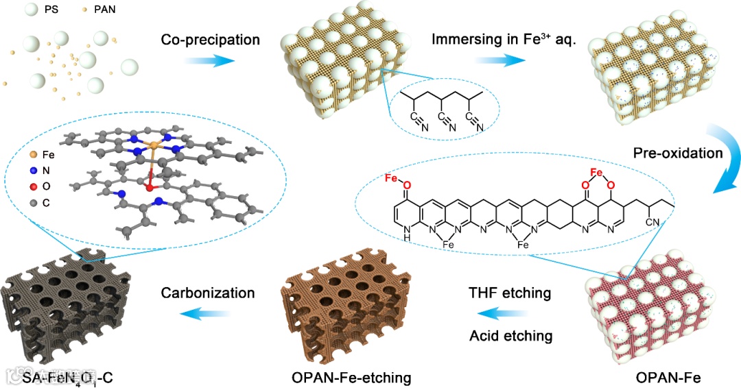 首先,该工作以聚丙烯腈为碳氮前体,在预氧化阶段引入Fe-O配位,构建单原子Fe的吸电子配位环境,进而形成N、O共配位结构。其次,采用胶体共沉淀法,以聚苯乙烯纳米球为牺牲模板,构建了三维框架结构和有序纳米孔道(图1)。Fe-N4O1单原子活性位点的独特配位环境和构建的三维框架有序结构,使该催化剂在ORR中表现出比Pt/C更优异的催化性能。