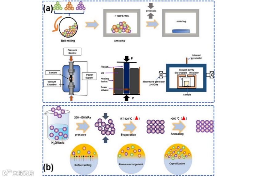 图3 (a)合成NASICON型电解质的固相烧结工艺、火花烧结工艺、冷烧结工艺和微波烧结工艺示意图;(b)冷烧结过程的机制示意图。