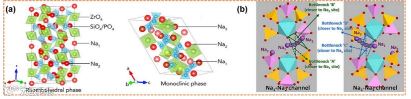 图2 (a) NASICON型的两种晶体结构;(b)单斜相NASICON中钠离子的Na1-Na2和Na1-Na3的迁移通道。