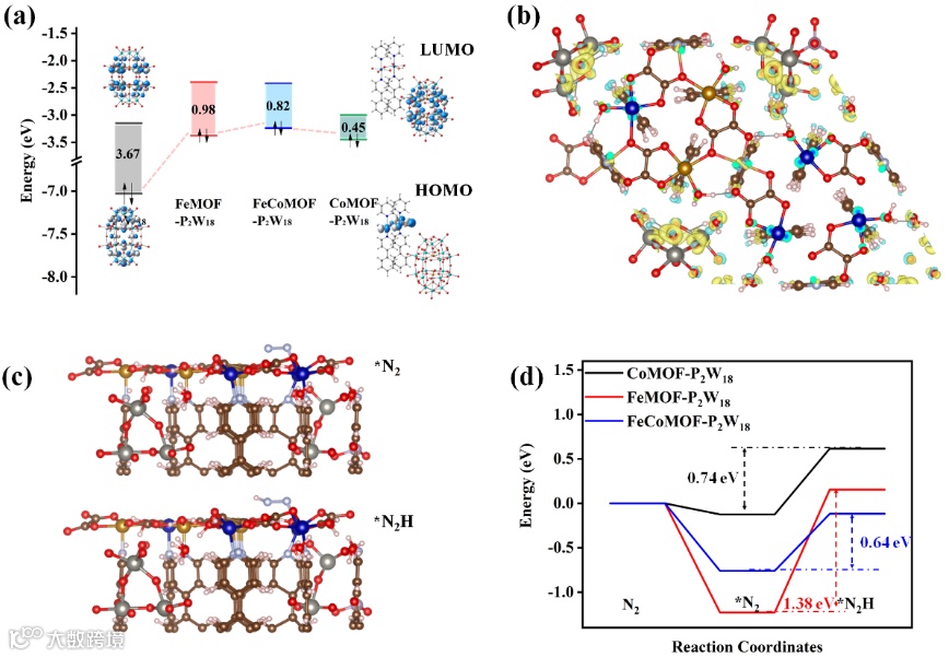 Figure 5. (a) Computed frontier orbitals (compositions and energies) for P2W18, FeMOF-P2W18, FeCoMOF-P2W18 and CoMOF-P2W18. (b) Charge density difference of FeCoMOF-P2W18 (isosurface: 0.005 eV Å-3). Charge accumulation and depletion are depicted in yellow and blue, respectively. P2W18 tend to carry a large amount of charge. (c) Optimized structures of the intermediates for e-NRR reaction (FeCoMOF-P2W18). (d) Gibbs free energies for catalysts. Note: an asterisk (*) denoted as the adsorption site.