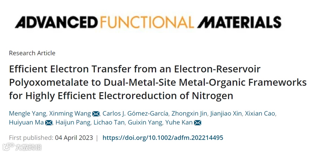 基于此,哈尔滨理工大学马慧媛教授和王新铭副教授团队在国际知名期刊Advanced Functional Materials上发表题为“Efficient Electron Transfer from an Electron-Reservoir Polyoxometalate to Dual-Metal-Site Metal-Organic Frameworks for Highly Efficient Electroreduction of Nitrogen”的研究论文。