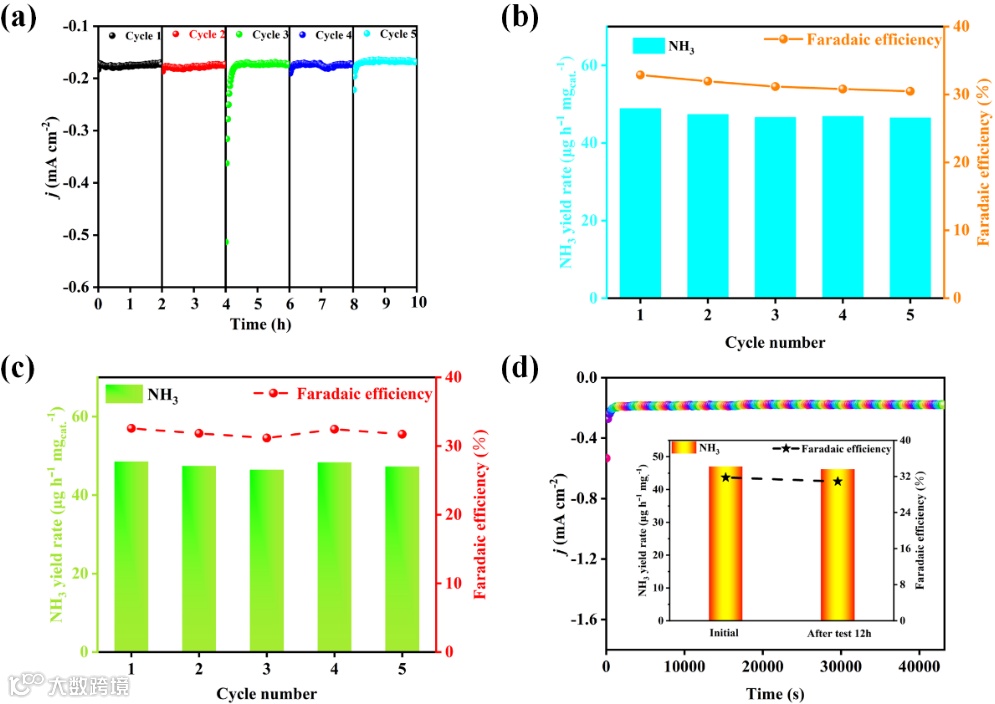 Figure 4. The FeCoMOF-P2W18 stability tests: (a) Chronoamperometry test at a constant potential for 5 cycles. Corresponding NH3 yield rates and FEs by (b) the indophenol blue and (c) the Nessler’s reagent methods. (d) j-t curve for 12 h of continuous e-NRR process (inset: the NH3 yields and FEs of before and after electrolysis for 12 h.